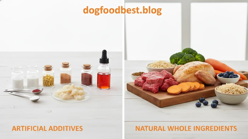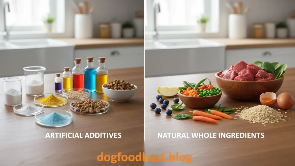 (Aqui você insere a Image 2 – ingredientes naturais comparados a aditivos artificiais, estilo educativo, sem cão na cena)